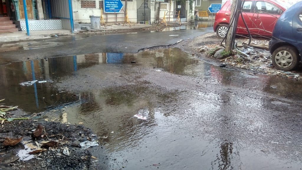 This probably looks like a picture of badly maintained roads on a rainy day. On the contrary, this is the picture of my locality in Velachery taken around 5.30 pm today evening. With the weather forecasting long sunny days ahead, what’s with the roads here flooded fresh with water?